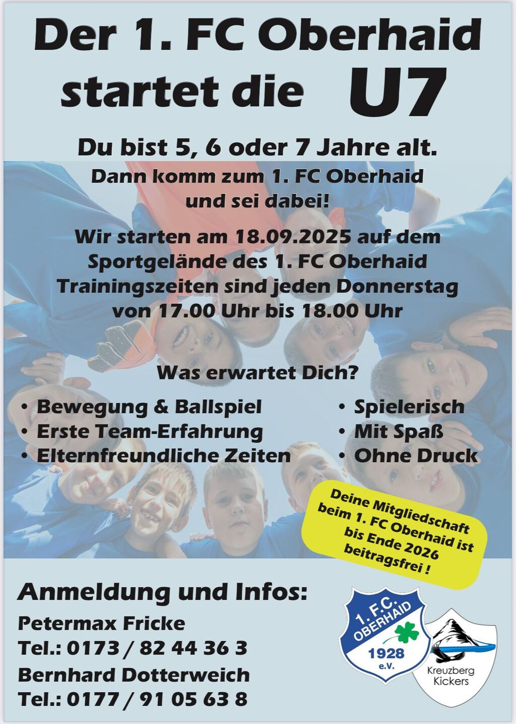 Der 1. FC Oberhaid lädt alle Kinder von 4–7 Jahren herzlich ein! Gemeinsam mit unserem erfahrenen Team wollen wir den Kleinen zeigen, wie viel Freude Bewegung, Ballspiele und Natur machen können – fernab von Tablets und Co.